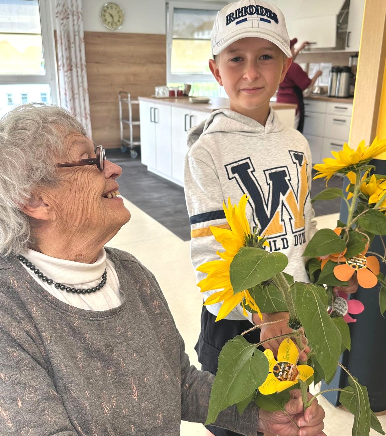 Die Idee zur „Sonnenblumenaktion“ war in einer Gruppenstunde entstanden. Dort bastelten die Ministranten zunächst Blumen aus Papier und verzierten sie mit persönlichen Segenswünschen und herzlichen Grüßen. Mit den selbstgestalteten Kunstwerken im Gepäck machten sie sich schließlich auf den Weg, um zusätzlich frische Sonnenblumen zu überreichen. Die leuchtenden Blumen zauberten ein Lächeln auf viele Gesichter und sorgten für eine heitere Stimmung. „Auch wenn es nur eine kleine Geste war, war es schön zu sehen, wie sehr sich die Menschen über die Aufmerksamkeiten gefreut haben“, sagte Mesnerin Lankes zum Abschluss der Aktion. (V.S.)